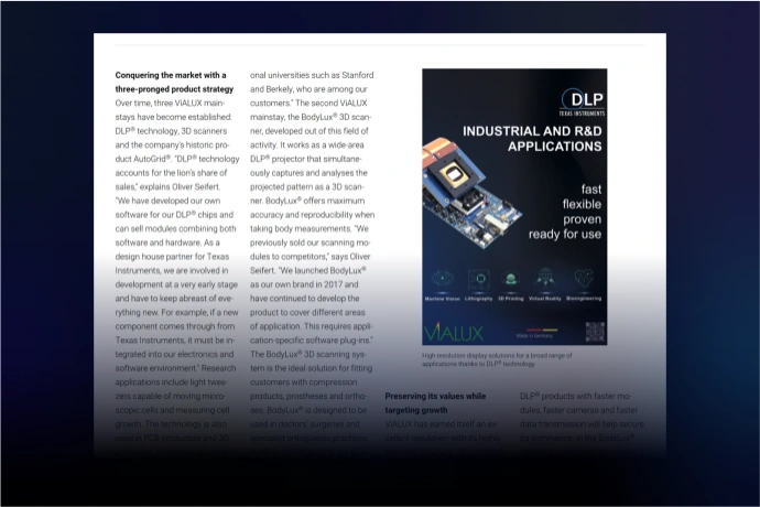 As a Design House Partner for the Texas Instruments DLP® product line, ViALUX has been supporting emerging DLP® technology applications for more than 20 years. Our DLP® subsystems provide customers with full access to the outstanding performance of DLP® technology and an easy entry into digital micro mirror technology. ViALUX engineers provide comprehensive consulting and product support including all aspects of high speed DMD control, solid state light sources and light engine design.